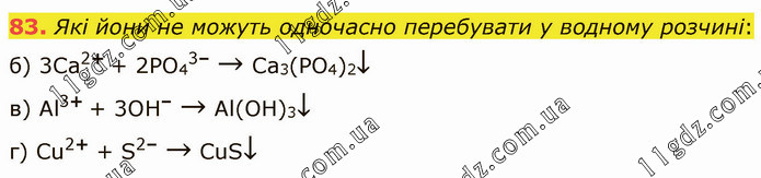 Які йони не можуть одночасно перебувати у водному розчині: б) 3Сa2+ + 2PO43– → Ca3(PO4)2↓ в) Al3+ + 3OH– → Al(OH)3↓ г) Cu2+ + S2– → CuS↓