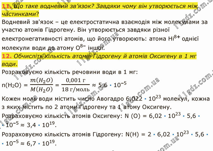Що таке водневий зв’язок? Завдяки чому він утворюється між частинками? Водневий зв'язок – це електростатична взаємодія між молекулами за участю атомів Гідрогену. Він утворюється завдяки різної електронегативності атомів, що його утворюють: атома Ні8+ однієї молекули води до атому О8– іншої. 12. Обчисліть кількість атомів Гідрогену й атомів Оксигену в 1 мг води. Розраховуємо кількість речовини води в 1 мг: n(H2O) = m(H_2 O)/M(H_2 O) = (0,001 г)/(18 г/моль) ≈ 5,6 ∙ 10–5 Кожен моль води містить число Авогадро 6,022 ∙ 1023 молекул, кожна з яких містить по 2 атоми Гідрогену та 1 атому Оксигену. Розраховуємо кількість атомів Оксигену: N (О) = 6,02 ∙ 1023 ∙ 5,6 ∙ ∙ 10–5 ≈ 3,4 ∙ 1019. Розраховуємо кількість атомів Гідрогену: N(Н) = 2 ∙ 6,02 ∙ 1023 ∙ 5,6 ∙ ∙ 10–5 ≈ 6,7 ∙ 1019.