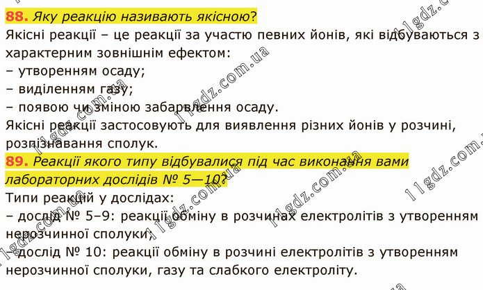 Яку реакцію називають якісною? Якісні реакції – це реакції за участю певних йонів, які відбуваються з характерним зовнішнім ефектом: – утворенням осаду; – виділенням газу; – появою чи зміною забарвлення осаду. Якісні реакції застосовують для виявлення різних йонів у розчині, розпізнавання сполук. 89. Реакції якого типу відбувалися під час виконання вами лабораторних дослідів № 5—10? Типи реакцій у дослідах: – дослід № 5–9: реакції обміну в розчинах електролітів з утворенням нерозчинної сполуки; – дослід № 10: реакції обміну в розчині електролітів з утворенням нерозчинної сполуки, газу та слабкого електроліту.