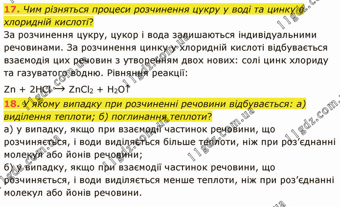 Чим різняться процеси розчинення цукру у воді та цинку в хлоридній кислоті? За розчинення цукру, цукор і вода залишаються індивідуальними речовинами. За розчинення цинку у хлоридній кислоті відбувається взаємодія цих речовин з утворенням двох нових: солі цинк хлориду та газуватого водню. Рівняння реакції: Zn + 2HCl → ZnCl2 + H2O↑ 18. У якому випадку при розчиненні речовини відбувається: а) виділення теплоти; б) поглинання теплоти? а) у випадку, якщо при взаємодії частинок речовини, що розчиняється, і води виділяється більше теплоти, ніж при роз’єднанні молекул або йонів речовини; б) у випадку, якщо при взаємодії частинок речовини, що розчиняється, і води виділяється менше теплоти, ніж при роз’єднанні молекул або йонів речовини.