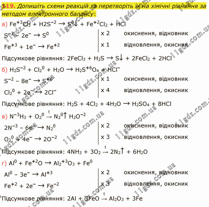 Допишіть схеми реакцій та перетворіть їх на хімічні рівняння за методом електронного балансу: a) Fe+3Cl3 + H2S–2 → S0↓ + Fe+2Cl2 + HCl S–2 – 2e– → S0 x 2 окиснення, відновник Fe+3 + 1e– → Fe+2 x 1 відновлення, окисник Підсумкове рівняння: 2FeCl3 + H2S → S↓ + 2FeCl2 + 2HCl б) H2S–2 + Cl20 + H2O → H2S+6O4 + HCl– S–2 – 8e– → S+6 x 1 окиснення, відновник Cl20 + 2e– → 2Cl– x 4 відновлення, окисник Підсумкове рівняння: H2S + 4Cl2 + 4H2O → H2SO4 + 8HCl в) N–3H3 + O20 →(t) N20↑ H2O–2 2N–3 – 6e– → N20 x 2 окиснення, відновник O20 + 4e– → 2O–2 x 3 відновлення, окисник Підсумкове рівняння: 4NH3 + 3O2 →(t) 2N2↑ + 6H2O г) Al0 + Fe+2O → Al2+3O3 + Fe0 Al0 – 3e– → Al+3 x 2 окиснення, відновник Fe+2 + 2e– → Fe–2 x 3 відновлення, окисник Підсумкове рівняння: 2Al + 3FeO →(t) Al2O3 + 3Fe