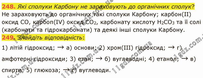 Які сполуки Карбону не зараховують до органічних сполук? Не зараховують до органічних такі сполуки Карбону; карбон(ІІ) оксид СО, карбоп(ІV) оксид СО2, карбонату кислоту Н2СO3 та її солі (карбонати та гідрокарбонати) та деякі інші сполуки Карбону. 249. Знайдіть відповідність: 1) літій гідроксид; → а) основи; 2) хром(ІІІ) гідроксид; → г) амфотерні гідроксиди; 3) етан; → б) вуглеводні; 4) етанол; → в) спирти; 5) глюкоза; → ґ) вуглеводи.