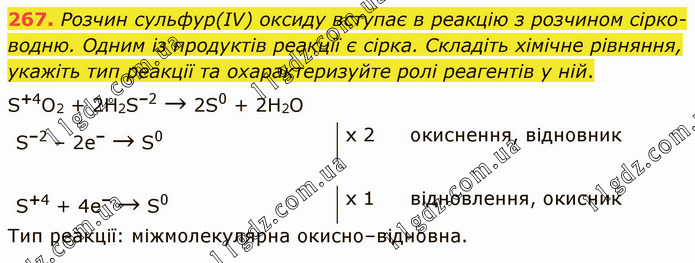 Розчин сульфур(IV) оксиду вступає в реакцію з розчином сірко-водню. Одним із продуктів реакції є сірка. Складіть хімічне рівняння, укажіть тип реакції та охарактеризуйте ролі реагентів у ній. S+4O2 + 2Н2S–2 → 2S0 + 2Н2O S–2 – 2e– → S0 x 2 окиснення, відновник S+4 + 4e– → S0 x 1 відновлення, окисник Тип реакції: міжмолекулярна окисно–відновна.