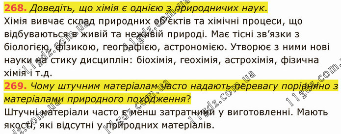 Доведіть, що хімія є однією з природничих наук. Хімія вивчає склад природних об’єктів та хімічні процеси, що відбуваються в живій та неживій природі. Має тісні зв’язки з біологією, фізикою, географією, астрономією. Утворює з ними нові науки на стику дисциплін: біохімія, геохімія, астрохімія, фізична хімія і т.д. 269. Чому штучним матеріалам часто надають перевагу порівняно з матеріалами природного походження? Штучні матеріали часто є менш затратними у виготовленні. Мають якості, які відсутні у природних матеріалів.