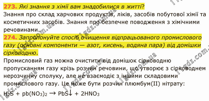 Які знання з хімії вам знадобилися в житті? Знання про склад харчових продуктів, ліків, засобів побутової хімії та косметичних засобів. Знання про безпечне поводження з хімічними речовинами. 274. Запропонуйте спосіб очищення відпрацьованого промислового газу (основні компоненти — азот, кисень, водяна пара) від домішки сірководню. Промисловий газ можна очистити від домішок сірководню пропусканням газу крізь розчин речовини, що утворює з сірководнем нерозчинну сполуку, але не взаємодіє з іншими складовими промислового газу. Це може бути розчин плюмбум(ІІ) нітрату: H2S + pb(NO3)2 → PbS↓ + 2HNO3
