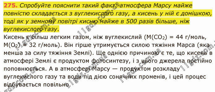 Спробуйте пояснити такий факт: атмосфера Марсу майже повністю складається з вуглекислого газу, а кисень у ній є домішкою, тоді як у земному повітрі кисню майже в 500 разів більше, ніж вуглекислого газу. Кисень є більш легким газом, ніж вуглекислий (М(СO2) = 44 г/моль, М(O2) = 32 г/моль). Він гірше утримується силою тяжіння Марса (яка менша за силу тяжіння Землі). Ще однією причиною є те, що кисень в атмосфері Землі є продуктом фотосинтезу, і з цього джерела постійно поповнюється. А в атмосфері Марсу — продуктом розкладу вуглекислого газу та води під дією сонячних променів, і цей процес відбувається повільно.