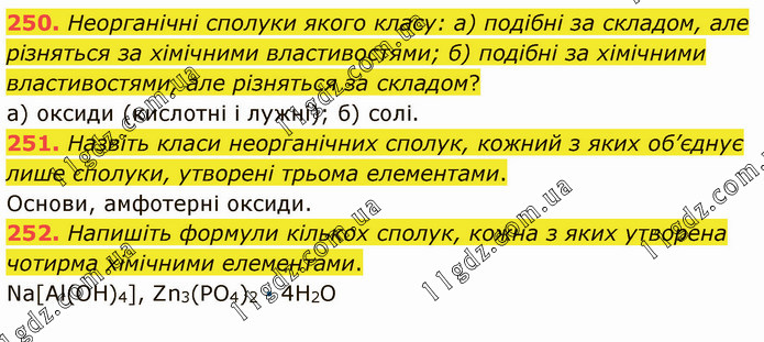 Неорганічні сполуки якого класу: а) подібні за складом, але різняться за хімічними властивостями; б) подібні за хімічними властивостями, але різняться за складом? а) оксиди (кислотні і лужні); б) солі. 251. Назвіть класи неорганічних сполук, кожний з яких об’єднує лише сполуки, утворені трьома елементами. Основи, амфотерні оксиди. 252. Напишіть формули кількох сполук, кожна з яких утворена чотирма хімічними елементами. Na[Al(OH)4], Zn3(PO4)2 ∙ 4H2O