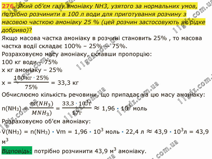 Який об’єм газу амоніаку NH3, узятого за нормальних умов, потрібно розчинити в 100 л води для приготування розчину з масовою часткою амоніаку 25 % (цей розчин застосовують як рідке добриво)? Якщо масова частка амоніаку в розчині становить 25% , то масова частка водії складає 100% – 25% — 75%. Розраховуємо масу амоніаку, склавши пропорцію: 100 кг води – 75% х кг амоніаку – 25% х = (100 кг ∙ 25%)/(75%) = 33,3 кг Обчислюємо кількість речовини, що припадає на цю масу амоніаку: n(NH3) = (m(NH_3))/(MNH_3)) = (33,3 ∙ 10^3 г)/17г ≈ 1,96 ∙ 103 моль Розраховуємо об’єм амоніаку: V(NH3) = n(NH3) ∙ Vm = 1,96 ∙ 103 моль ∙ 22,4 л ≈ 43,9 ∙ 103л = 43,9 м3 Відповідь: потрібно розчинити 43,9 м3 амоніаку.