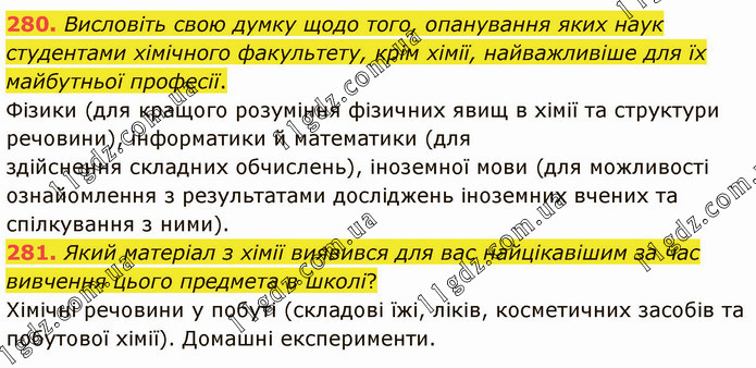 Висловіть свою думку щодо того, опанування яких наук студентами хімічного факультету, крім хімії, найважливіше для їх майбутньої професії. Фізики (для кращого розуміння фізичних явищ в хімії та структури речовини), інформатики й математики (для здійснення складних обчислень), іноземної мови (для можливості ознайомлення з результатами досліджень іноземних вчених та спілкування з ними). 281. Який матеріал з хімії виявився для вас найцікавішим за час вивчення цього предмета в школі? Хімічні речовини у побуті (складові їжі, ліків, косметичних засобів та побутової хімії). Домашні експерименти.