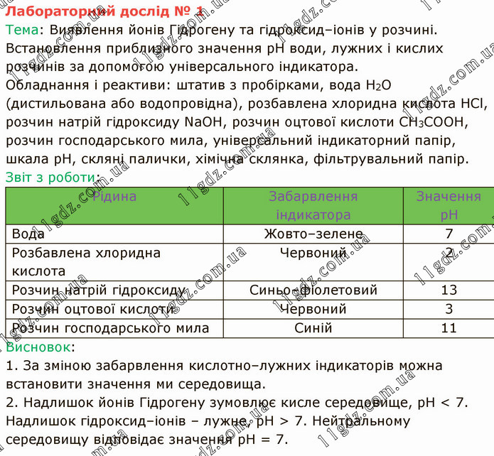 Тема: Виявлення йонів Гідрогену та гідроксид–іонів у розчині. Встановлення приблизного значення рН води, лужних і кислих розчинів за допомогою універсального індикатора. Обладнання і реактиви: штатив з пробірками, вода Н2О (дистильована або водопровідна), розбавлена хлоридна кислота НСl, розчин натрій гідроксиду NаОН, розчин оцтової кислоти СН3СООН, розчин господарського мила, універсальний індикаторний папір, шкала рН, скляні палички, хімічна склянка, фільтрувальний папір. Звіт з роботи: Висновок: 1. За зміною забарвлення кислотно–лужних індикаторів можна встановити значення ми середовища. 2. Надлишок йонів Гідрогену зумовлює кисле середовище, pH < 7. Надлишок гідроксид–іонів – лужне, pH > 7. Нейтральному середовищу відповідає значення pH = 7.