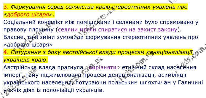 3. Формування серед селянства краю стереотипних уявлень про «доброго цісаря». Соціальний конфлікт між поміщиками і селянами було спрямовано у правову площину (селяни могли спиратися на захист закону). Власне, такі зміни зумовили формування стереотипних уявлень про «доброго цісаря» 4. Потурання з боку австрійської влади процесам денаціоналізації українців краю. Австрійська влада прагнула «вирівняти» етнічний склад населення імперії, тому підживлювала процеси денаціоналізації, асиміляції українського населення, потураючи польським шляхтичам у Галичині у їхніх діях із полонізації українців.