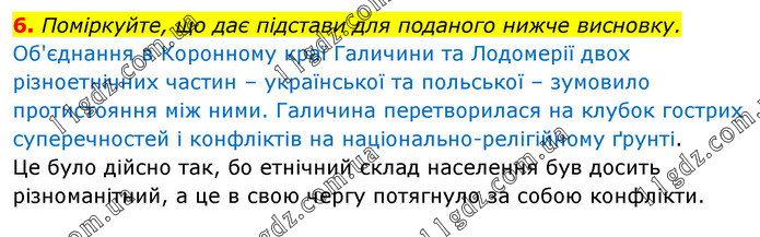 Поміркуйте, що дає підстави для поданого нижче висновку. Об'єднання в Коронному краї Галичини та Лодомерії двох різноетнічних частин – української та польської – зумовило протистояння між ними. Галичина перетворилася на клубок гострих суперечностей і конфліктів на національно-релігійному ґрунті. Це було дійсно так, бо етнічний склад населення був досить різноманітний, а це в свою чергу потягнуло за собою конфлікти.