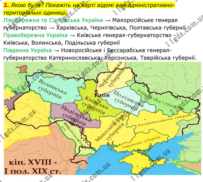Якою була? Покажіть на карті відомі вам адміністративно-територіальні одиниці. Лівобережна та Слобідська Україна → Малоросійське генерал губернаторство → Харківська, Чернігівська, Полтавська губернії Правобережна Україна → Київське генерал-губернаторство - Київська, Волинська, Подільська губернії Південна Україна → Новоросійське і Бессарабське генерал-губернаторство Катеринославська, Херсонська, Таврійська губернії.