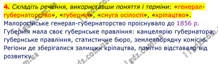 Складіть речення, використавши поняття і терміни: «генерал-губернаторство», «губернія», «смуга осілості», «кріпацтво». Малоросійське генерал-губернаторство проіснувало до 1856 р. Губернія мала своє губернське правління: канцелярію губернатора, губернське правління, статистичне бюро, землевпорядну комісію. Регіони де зберігалися залишки кріпацтва, помітно відставало від розвитку.