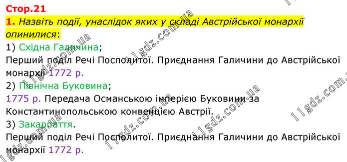 Назвіть події, унаслідок яких у складі Австрійської монархії опинилися: 1) Східна Галичина; Перший поділ Речі Посполитої. Приєднання Галичини до Австрійської монархії 1772 р. 2) Північна Буковина; 1775 р. Передача Османською імперією Буковини за Константинопольською конвенцією Австрії. 3) Закарпаття. Перший поділ Речі Посполитої. Приєднання Галичини до Австрійської монархії 1772 р.
