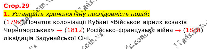 Установіть хронологічну послідовність подій: (1792) Початок колонізації Кубані «Військом вірних козаків Чорноморських» → (1812) Російсько-французька війна → (1828) ліквідація Задунайської Січі.