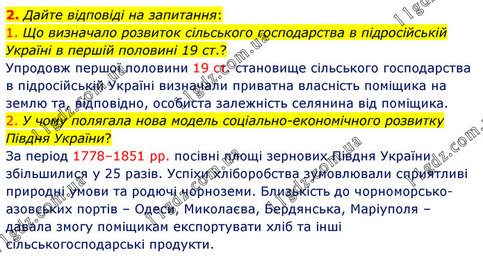 Дайте відповіді на запитання: 1. Що визначало розвиток сільського господарства в підросійській Україні в першій половині 19 ст.? Упродовж першої половини 19 ст. становище сільського господарства в підросійській Україні визначали приватна власність поміщика на землю та, відповідно, особиста залежність селянина від поміщика. 2. У чому полягала нова модель соціально-економічного розвитку Півдня України? За період 1778–1851 рр. посівні площі зернових Півдня України збільшилися у 25 разів. Успіхи хліборобства зумовлювали сприятливі природні умови та родючі чорноземи. Близькість до чорноморсько-азовських портів – Одеси, Миколаєва, Бердянська, Маріуполя – давала змогу поміщикам експортувати хліб та інші сільськогосподарські продукти.