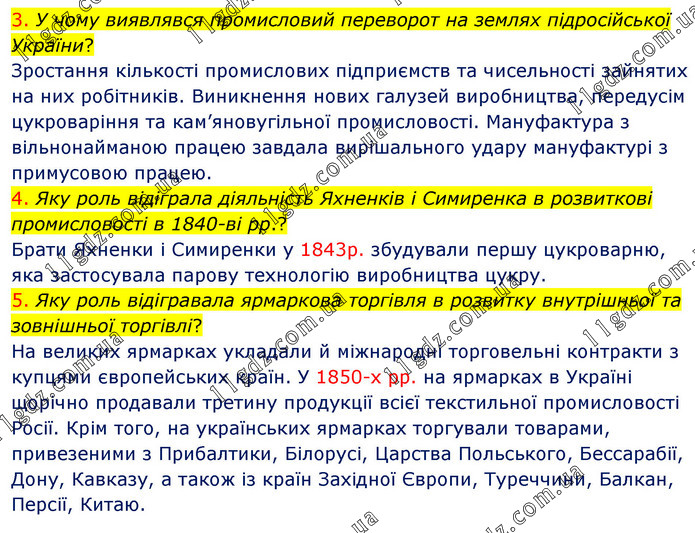 3. У чому виявлявся промисловий переворот на землях підросійської України? Зростання кількості промислових підприємств та чисельності зайнятих на них робітників. Виникнення нових галузей виробництва, передусім цукроваріння та кам’яновугільної промисловості. Мануфактура з вільнонайманою працею завдала вирішального удару мануфактурі з примусовою працею. 4. Яку роль відіграла діяльність Яхненків і Симиренка в розвиткові промисловості в 1840-ві рр.? Брати Яхненки і Симиренки у 1843р. збудували першу цукроварню, яка застосувала парову технологію виробництва цукру. 5. Яку роль відігравала ярмаркова торгівля в розвитку внутрішньої та зовнішньої торгівлі? На великих ярмарках укладали й міжнародні торговельні контракти з купцями європейських країн. У 1850-х рр. на ярмарках в Україні щорічно продавали третину продукції всієї текстильної промисловості Росії. Крім того, на українських ярмарках торгували товарами, привезеними з Прибалтики, Білорусі, Царства Польського, Бессарабії, Дону, Кавказу, а також із країн Західної Європи, Туреччини, Балкан, Персії, Китаю.
