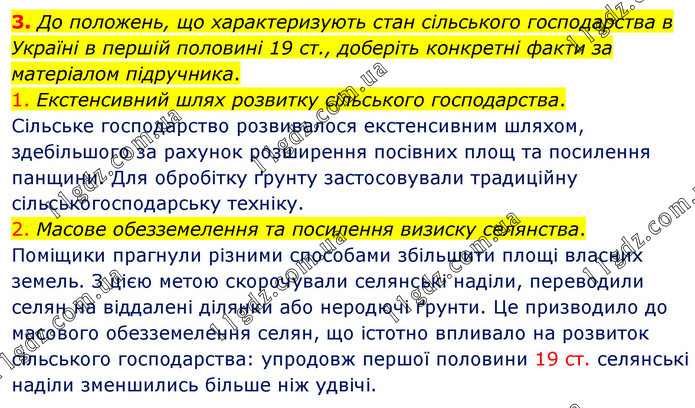 3. До положень, що характеризують стан сільського господарства в Україні в першій половині 19 ст., доберіть конкретні факти за матеріалом підручника. 1. Екстенсивний шлях розвитку сільського господарства. Сільське господарство розвивалося екстенсивним шляхом, здебільшого за рахунок розширення посівних площ та посилення панщини. Для обробітку ґрунту застосовували традиційну сільськогосподарську техніку. 2. Масове обезземелення та посилення визиску селянства. Поміщики прагнули різними способами збільшити площі власних земель. З цією метою скорочували селянські наділи, переводили селян на віддалені ділянки або неродючі ґрунти. Це призводило до масового обезземелення селян, що істотно впливало на розвиток сільського господарства: упродовж першої половини 19 ст. селянські наділи зменшились більше ніж удвічі.
