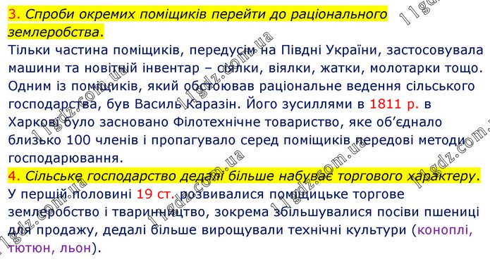 3. Спроби окремих поміщиків перейти до раціонального землеробства. Тільки частина поміщиків, передусім на Півдні України, застосовувала машини та новітній інвентар – сіялки, віялки, жатки, молотарки тощо. Одним із поміщиків, який обстоював раціональне ведення сільського господарства, був Василь Каразін. Його зусиллями в 1811 р. в Харкові було засновано Філотехнічне товариство, яке об’єднало близько 100 членів і пропагувало серед поміщиків передові методи господарювання. 4. Сільське господарство дедалі більше набуває торгового характеру. У першій половині 19 ст. розвивалися поміщицьке торгове землеробство і тваринництво, зокрема збільшувалися посіви пшениці для продажу, дедалі більше вирощували технічні культури (коноплі, тютюн, льон).