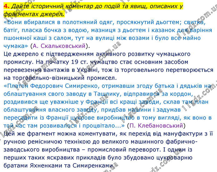 Дайте історичний коментар до подій та явищ, описаних у фрагментах джерел. «Вони вбиралися в полотняний одяг, просякнутий дьогтем; свитка, батіг, пласка бочка з водою, мазниця з дьогтем і казанок для варіння пшоняної каші з салом, тут на вулиці між возами і було все майно чумака» (А. Скальковський). Це джерело є підтвердженням активного розвитку чумацького промислу. На початку 19 ст. чумацтво стає основним засобом перевезення вантажів в Україні, тож із торговельного перетворюється на торговельно-візницький промисел. «Платон Федорович Симиренко, отримавши згоду батька і дядьків на облаштування свого заводу в Ташлику, відправився за кордон, роздивився ще уважніше у Франції всі кращі заводи, склав там план облаштування власного заводу, придбав машини і задумав пересадити із Франції цукрове виробництво в тому вигляді, як воно в той час там розвивалося і процвітало...» (П. Клебановський) Цей же фрагмент можна коментувати, як перехід від мануфактури з її ручною ремісничою технікою до великого машинного фабрично-заводського виробництва – промисловий переворот. І одним із перших таких яскравих прикладів було збудовано цукроварню братами Яхненками та Симиренками.