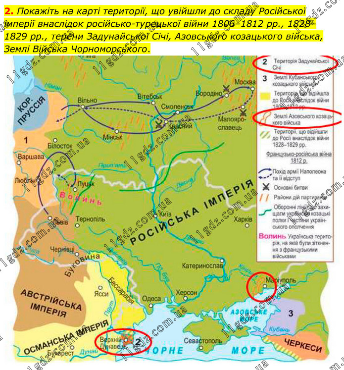 Покажіть на карті території, що увійшли до складу Російської імперії внаслідок російсько-турецької війни 1806–1812 рр., 1828–1829 рр., терени Задунайської Січі, Азовського козацького війська, Землі Війська Чорноморського.
