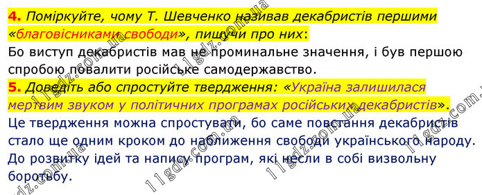 4. Поміркуйте, чому Т. Шевченко називав декабристів першими «благовісниками свободи», пишучи про них: Бо виступ декабристів мав не проминальне значення, і був першою спробою повалити російське самодержавство. 5. Доведіть або спростуйте твердження: «Україна залишилася мертвим звуком у політичних програмах російських декабристів». Це твердження можна спростувати, бо саме повстання декабристів стало ще одним кроком до наближення свободи українського народу. До розвитку ідей та напису програм, які несли в собі визвольну боротьбу.