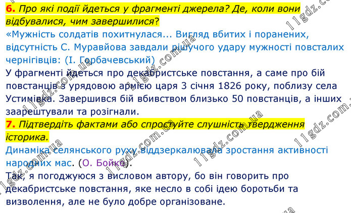 6. Про які події йдеться у фрагменті джерела? Де, коли вони відбувалися, чим завершилися? «Мужність солдатів похитнулася... Вигляд вбитих і поранених, відсутність С. Муравйова завдали рішучого удару мужності повсталих чернігівців: (І. Горбачевський) У фрагменті йдеться про декабристське повстання, а саме про бій повстанців з урядовою армією царя 3 січня 1826 року, поблизу села Устимівка. Завершився бій вбивством близько 50 повстанців, а інших заарештували та розігнали. 7. Підтвердіть фактами або спростуйте слушність твердження історика. Динаміка селянського руху віддзеркалювала зростання активності народних мас. (О. Бойко). Так, я погоджуюся з висловом автору, бо він говорить про декабристське повстання, яке несло в собі ідею боротьби та визволення, але не було добре організоване.