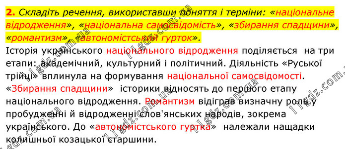 Складіть речення, використавши поняття і терміни: «національне відродження», «національна самосвідомість», «збирання спадщини», «романтизм», «автономістський гурток». Історія українського національного відродження поділяється на три етапи: академічний, культурний і політичний. Діяльність «Руської трійці» вплинула на формування національної самосвідомості. «Збирання спадщини» історики відносять до першого етапу національного відродження. Романтизм відіграв визначну роль у пробудженні й відродженні слов'янських народів, зокрема українського. До «автономістського гуртка» належали нащадки колишньої козацької старшини.