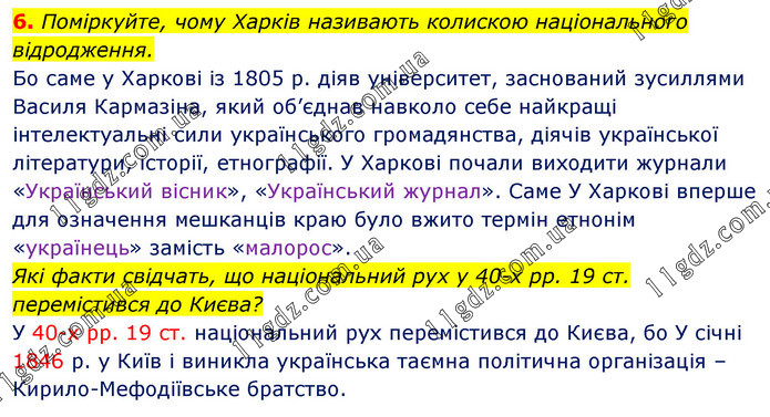Поміркуйте, чому Харків називають колискою національного відродження. Бо саме у Харкові із 1805 р. діяв університет, заснований зусиллями Василя Кармазіна, який об’єднав навколо себе найкращі інтелектуальні сили українського громадянства, діячів української літератури, історії, етнографії. У Харкові почали виходити журнали «Український вісник», «Український журнал». Саме У Харкові вперше для означення мешканців краю було вжито термін етнонім «українець» замість «малорос». Які факти свідчать, що національний рух у 40-х рр. 19 ст. перемістився до Києва? У 40-х рр. 19 ст. національний рух перемістився до Києва, бо У січні 1846 р. у Київ і виникла українська таємна політична організація – Кирило-Мефодіївське братство.