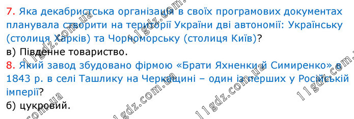 7. Яка декабристська організація в своїх програмових документах планувала створити на території України дві автономії: Українську (столиця Харків) та Чорноморську (столиця Київ)? в) Південне товариство. 8. Який завод збудовано фірмою «Брати Яхненки й Симиренко» в 1843 р. в селі Ташлику на Черкащині – один із перших у Російській імперії? б) цукровий.