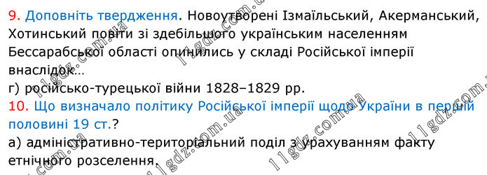 9. Доповніть твердження. Новоутворені Ізмаїльський, Акерманський, Хотинський повіти зі здебільшого українським населенням Бессарабської області опинились у складі Російської імперії внаслідок… г) російсько-турецької війни 1828–1829 рр. 10. Що визначало політику Російської імперії щодо України в першій половині 19 ст.? а) адміністративно-територіальний поділ з урахуванням факту етнічного розселення.