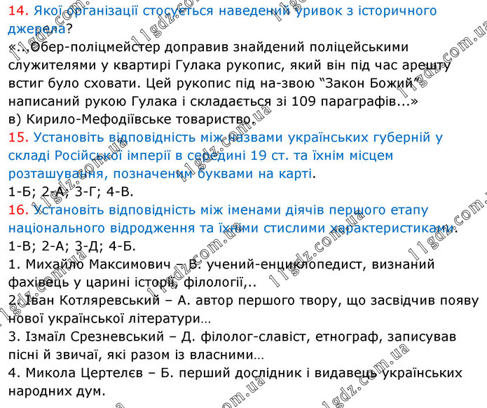 14. Якої організації стосується наведений уривок з історичного джерела? «...Обер-поліцмейстер доправив знайдений поліцейськими служителями у квартирі Гулака рукопис, який він під час арешту встиг було сховати. Цей рукопис під на-звою “Закон Божий” написаний рукою Гулака і складається зі 109 параграфів...» в) Кирило-Мефодіївське товариство. 15. Установіть відповідність між назвами українських губерній у складі Російської імперії в середині 19 ст. та їхнім місцем розташування, позначеним буквами на карті. 1-Б; 2-А; 3-Г; 4-В. 16. Установіть відповідність між іменами діячів першого етапу національного відродження та їхніми стислими характеристиками. 1-В; 2-А; 3-Д; 4-Б. 1. Михайло Максимович – В. учений-енциклопедист, визнаний фахівець у царині історії, філології,.. 2. Іван Котляревський – А. автор першого твору, що засвідчив появу нової української літератури… 3. Ізмаїл Срезневський – Д. філолог-славіст, етнограф, записував пісні й звичаї, які разом із власними… 4. Микола Цертелєв – Б. перший дослідник і видавець українських народних дум.