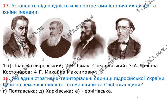 17. Установіть відповідність між портретами історичних діячів та їхніми іменами. 1-Д. Іван Котляревський; 2-В. Ізмаїл Срезневський; 3-А. Микола Костомаров; 4-Г. Михайло Максимович. 18. Які адміністративно-територіальні одиниці підросійської України були на землях колишніх Гетьманщини та Слобожанщини? г) Полтавська; д) Харківська; е) Чернігівська.