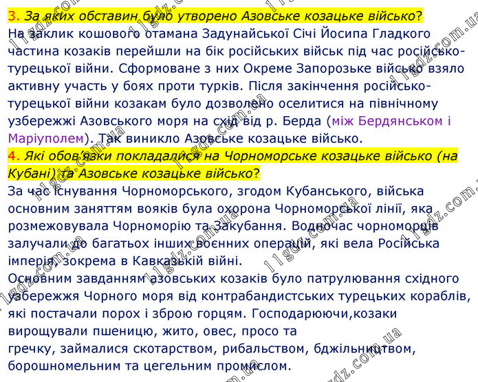 3. За яких обставин було утворено Азовське козацьке військо? На заклик кошового отамана Задунайської Січі Йосипа Гладкого частина козаків перейшли на бік російських військ під час російсько-турецької війни. Сформоване з них Окреме Запорозьке військо взяло активну участь у боях проти турків. Після закінчення російсько-турецької війни козакам було дозволено оселитися на північному узбережжі Азовського моря на схід від р. Берда (між Бердянськом і Маріуполем). Так виникло Азовське козацьке військо. 4. Які обов’язки покладалися на Чорноморське козацьке військо (на Кубані) та Азовське козацьке військо? За час існування Чорноморського, згодом Кубанського, війська основним заняттям вояків була охорона Чорноморської лінії, яка розмежовувала Чорноморію та Закубання. Водночас чорноморців залучали до багатьох інших воєнних операцій, які вела Російська імперія, зокрема в Кавказькій війні. Основним завданням азовських козаків було патрулювання східного узбережжя Чорного моря від контрабандистських турецьких кораблів, які постачали порох і зброю горцям. Господарюючи,козаки вирощували пшеницю, жито, овес, просо та гречку, займалися скотарством, рибальством, бджільництвом, борошномельним та цегельним промислом.
