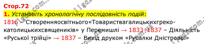 1. Установіть хронологічну послідовність подій: 1816 – Створенняосвітнього«Товариствагалицькихгреко-католицькихсвящеників» у Перемишлі → 1833–1837 – Діяльність «Руської трійці» → 1837 – Вихід друком «Русалки Дністрової»