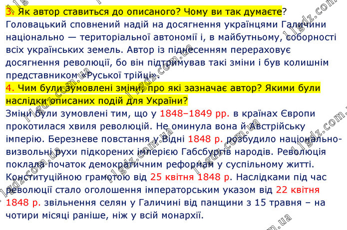 3. Як автор ставиться до описаного? Чому ви так думаєте? Головацький сповнений надій на досягнення українцями Галичини національно — територіальної автономії і, в майбутньому, соборності всіх українських земель. Автор із піднесенням перераховує досягнення революції, бо він підтримував такі зміни і був колишнім представником «Руської трійці». 4. Чим були зумовлені зміни, про які зазначає автор? Якими були наслідки описаних подій для України? Зміни були зумовлені тим, що у 1848–1849 рр. в країнах Європи прокотилася хвиля революцій. Не оминула вона й Австрійську імперію. Березневе повстання у Відні 1848 р. розбудило національно-визвольні рухи підкорених імперією Габсбургів народів. Революція поклала початок демократичним реформам у суспільному житті. Конституційною грамотою від 25 квітня 1848 р. Наслідками під час революції стало оголошення імператорським указом від 22 квітня 1848 р. звільнення селян у Галичині від панщини з 15 травня – на чотири місяці раніше, ніж у всій монархії.