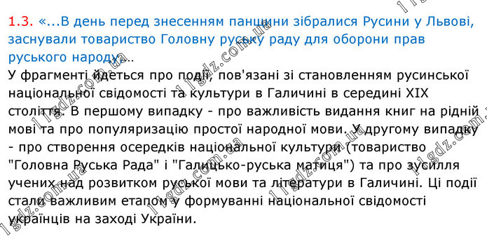 1.3. «...В день перед знесенням панщини зібралися Русини у Львові, заснували товариство Головну руську раду для оборони прав руського народу,… У фрагменті йдеться про події, пов'язані зі становленням русинської національної свідомості та культури в Галичині в середині XIX століття. В першому випадку - про важливість видання книг на рідній мові та про популяризацію простої народної мови. У другому випадку - про створення осередків національної культури (товариство "Головна Руська Рада" і "Галицько-руська матиця") та про зусилля учених над розвитком руської мови та літератури в Галичині. Ці події стали важливим етапом у формуванні національної свідомості українців на заході України.