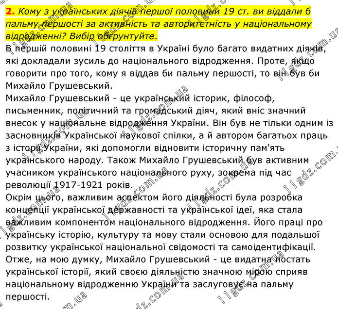 Кому з українських діячів першої половини 19 ст. ви віддали б пальму першості за активність та авторитетність у національному відродженні? Вибір обґрунтуйте. В першій половині 19 століття в Україні було багато видатних діячів, які докладали зусиль до національного відродження. Проте, якщо говорити про того, кому я віддав би пальму першості, то він був би Михайло Грушевський. Михайло Грушевський - це український історик, філософ, письменник, політичний та громадський діяч, який вніс значний внесок у національне відродження України. Він був не тільки одним із засновників Української наукової спілки, а й автором багатьох праць з історії України, які допомогли відновити історичну пам'ять українського народу. Також Михайло Грушевський був активним учасником українського національного руху, зокрема під час революції 1917-1921 років. Окрім цього, важливим аспектом його діяльності була розробка концепції української державності та української ідеї, яка стала важливим компонентом національного відродження. Його праці про українську історію, культуру та мову стали основою для подальшої розвитку української національної свідомості та самоідентифікації. Отже, на мою думку, Михайло Грушевський - це видатна постать української історії, який своєю діяльністю значною мірою сприяв національному відродженню України та заслуговує на пальму першості.