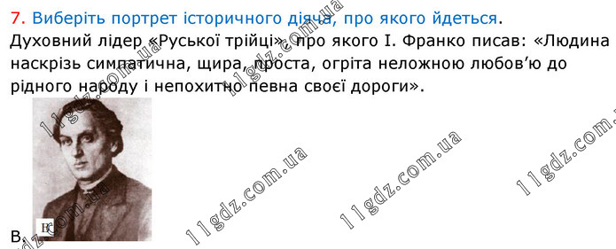 7. Виберіть портрет історичного діяча, про якого йдеться. Духовний лідер «Руської трійці», про якого І. Франко писав: «Людина наскрізь симпатична, щира, проста, огріта неложною любов’ю до рідного народу і непохитно певна своєї дороги». В.