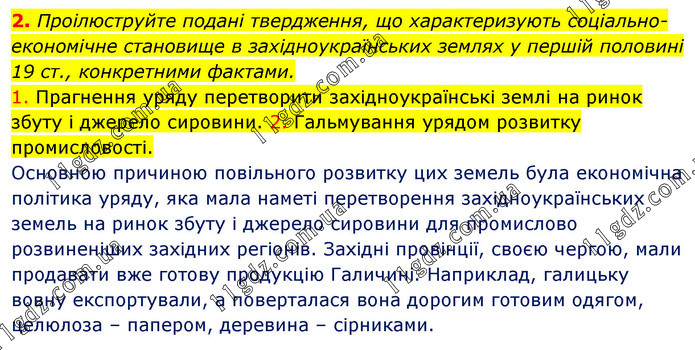 2. Проілюструйте подані твердження, що характеризують соціально-економічне становище в західноукраїнських землях у першій половині 19 ст., конкретними фактами. 1. Прагнення уряду перетворити західноукраїнські землі на ринок збуту і джерело сировини. 2. Гальмування урядом розвитку промисловості. Основною причиною повільного розвитку цих земель була економічна політика уряду, яка мала наметі перетворення західноукраїнських земель на ринок збуту і джерело сировини для промислово розвиненіших західних регіонів. Західні провінції, своєю чергою, мали продавати вже готову продукцію Галичині. Наприклад, галицьку вовну експортували, а поверталася вона дорогим готовим одягом, целюлоза – папером, деревина – сірниками.