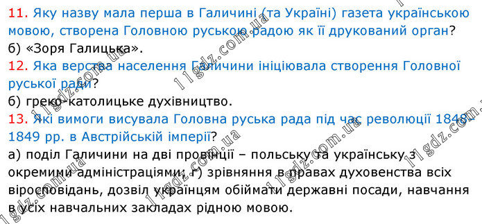 11. Яку назву мала перша в Галичині (та Україні) газета українською мовою, створена Головною руською радою як її друкований орган? б) «Зоря Галицька». 12. Яка верства населення Галичини ініціювала створення Головної руської ради? б) греко-католицьке духівництво. 13. Які вимоги висувала Головна руська рада під час революції 1848–1849 рр. в Австрійській імперії? а) поділ Галичини на дві провінції – польську та українську з окремими адміністраціями; г) зрівняння в правах духовенства всіх віросповідань, дозвіл українцям обіймати державні посади, навчання в усіх навчальних закладах рідною мовою.