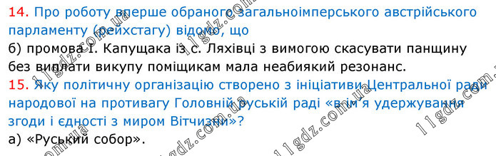 14. Про роботу вперше обраного загальноімперського австрійського парламенту (рейхстагу) відомо, що б) промова І. Капущака із с. Ляхівці з вимогою скасувати панщину без виплати викупу поміщикам мала неабиякий резонанс. 15. Яку політичну організацію створено з ініціативи Центральної ради народової на противагу Головній руській раді «в ім’я удержування згоди і єдності з миром Вітчизни»? а) «Руський собор».