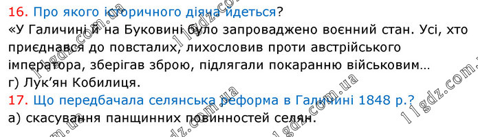 16. Про якого історичного діяча йдеться? «У Галичині й на Буковині було запроваджено воєнний стан. Усі, хто приєднався до повсталих, лихословив проти австрійського імператора, зберігав зброю, підлягали покаранню військовим… г) Лук’ян Кобилиця. 17. Що передбачала селянська реформа в Галичині 1848 р.? а) скасування панщинних повинностей селян.