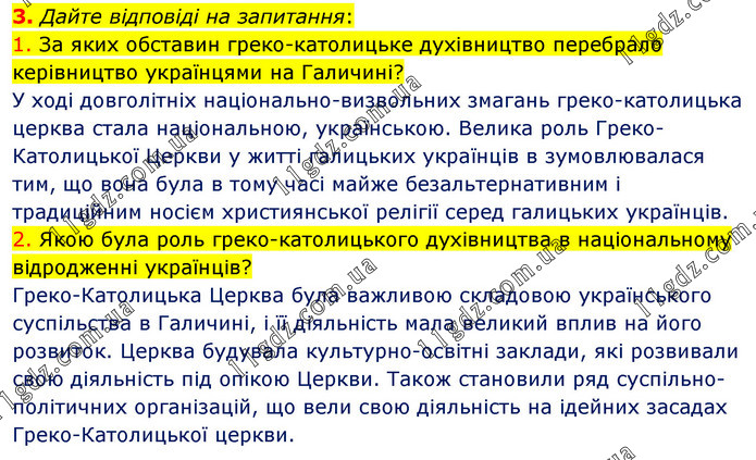 Дайте відповіді на запитання: 1. За яких обставин греко-католицьке духівництво перебрало керівництво українцями на Галичині? У ході довголітніх національно-визвольних змагань греко-католицька церква стала національною, українською. Велика роль Греко-Католицької Церкви у житті галицьких українців в зумовлювалася тим, що вона була в тому часі майже безальтернативним і традиційним носієм християнської релігії серед галицьких українців. 2. Якою була роль греко-католицького духівництва в національному відродженні українців? Греко-Католицька Церква була важливою складовою українського суспільства в Галичині, і її діяльність мала великий вплив на його розвиток. Церква будувала культурно-освітні заклади, які розвивали свою діяльність під опікою Церкви. Також становили ряд суспільно-політичних організацій, що вели свою діяльність на ідейних засадах Греко-Католицької церкви.
