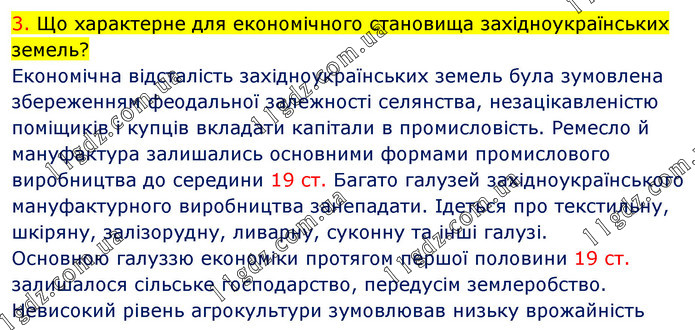 Що характерне для економічного становища західноукраїнських земель? Економічна відсталість західноукраїнських земель була зумовлена збереженням феодальної залежності селянства, незацікавленістю поміщиків і купців вкладати капітали в промисловість. Ремесло й мануфактура залишались основними формами промислового виробництва до середини 19 ст. Багато галузей західноукраїнського мануфактурного виробництва занепадати. Ідеться про текстильну, шкіряну, залізорудну, ливарну, суконну та інші галузі. Основною галуззю економіки протягом першої половини 19 ст. залишалося сільське господарство, передусім землеробство. Невисокий рівень агрокультури зумовлював низьку врожайність