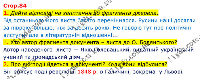 1. Дайте відповіді на запитання до фрагмента джерела. Від останнього мого листа багато перемінилося. Русини наші досягли за півроку більше, ніж за десять років. Не говорю тут про політичні виступи, але в літературнім відношенні... 1. Хто автор фрагмента документа – листа до О. Бодянського? Автор наведеного листа — Яків Головацький, видатний український учений та громадський діяч. 2. Про які події йдеться в документі? Коли вони відбулися? Він описує події революції 1848 р. в Галичині, зокрема у Львові.