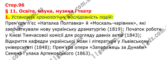 § 11. Освіта, наука, музика і театр 1. Установіть хронологічну послідовність подій: Прем’єри п’єс «Наталка Полтавка» й «Москаль-чарівник», які започаткували нову українську драматургію (1819); Початок роботи у Києві Тимчасової комісії для розгляду давніх актів (1843); Відкриття кафедри української мови і літератури у Львівському університеті (1848); Прем’єра опери «Запорожець за Дунаєм» Семена Гулака Артемовського (1863).