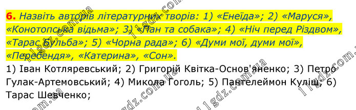 Назвіть авторів літературних творів: 1) «Енеїда»; 2) «Маруся», «Конотопська відьма»; 3) «Пан та собака»; 4) «Ніч перед Різдвом», «Тарас Бульба»; 5) «Чорна рада»; 6) «Думи мої, думи мої», «Перебендя», «Катерина», «Сон». 1) Іван Котляревський; 2) Григорій Квітка-Основ'яненко; 3) Петро Гулак-Артемовський; 4) Микола Гоголь; 5) Пантелеймон Куліш; 6) Тарас Шевченко;