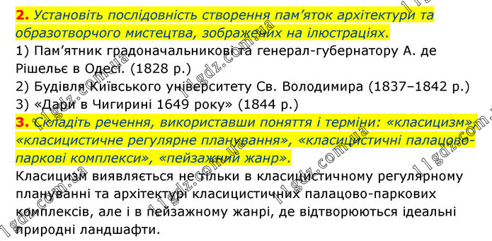 2. Установіть послідовність створення пам’яток архітектури та образотворчого мистецтва, зображених на ілюстраціях. 1) Пам’ятник градоначальникові та генерал-губернатору А. де Рішельє в Одесі. (1828 р.) 2) Будівля Київського університету Св. Володимира (1837–1842 р.) 3) «Дари в Чигирині 1649 року» (1844 р.) 3. Складіть речення, використавши поняття і терміни: «класицизм», «класицистичне регулярне планування», «класицистичні палацово-паркові комплекси», «пейзажний жанр». Класицизм виявляється не тільки в класицистичному регулярному плануванні та архітектурі класицистичних палацово-паркових комплексів, але і в пейзажному жанрі, де відтворюються ідеальні природні ландшафти.